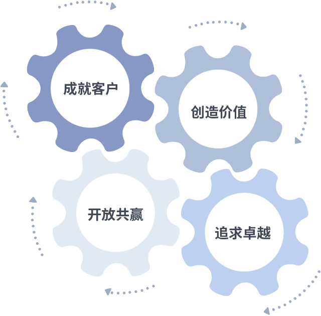 成就客户是一切决策的出发点,,创造价值是衡量所有工作的标准,,追求卓越是我们做事做人的态度,,,开放共赢是我们的格局也是最终的结果。。。价值观的齿轮环环相扣,,,,推动着组织里的每个人不断向前。。。。